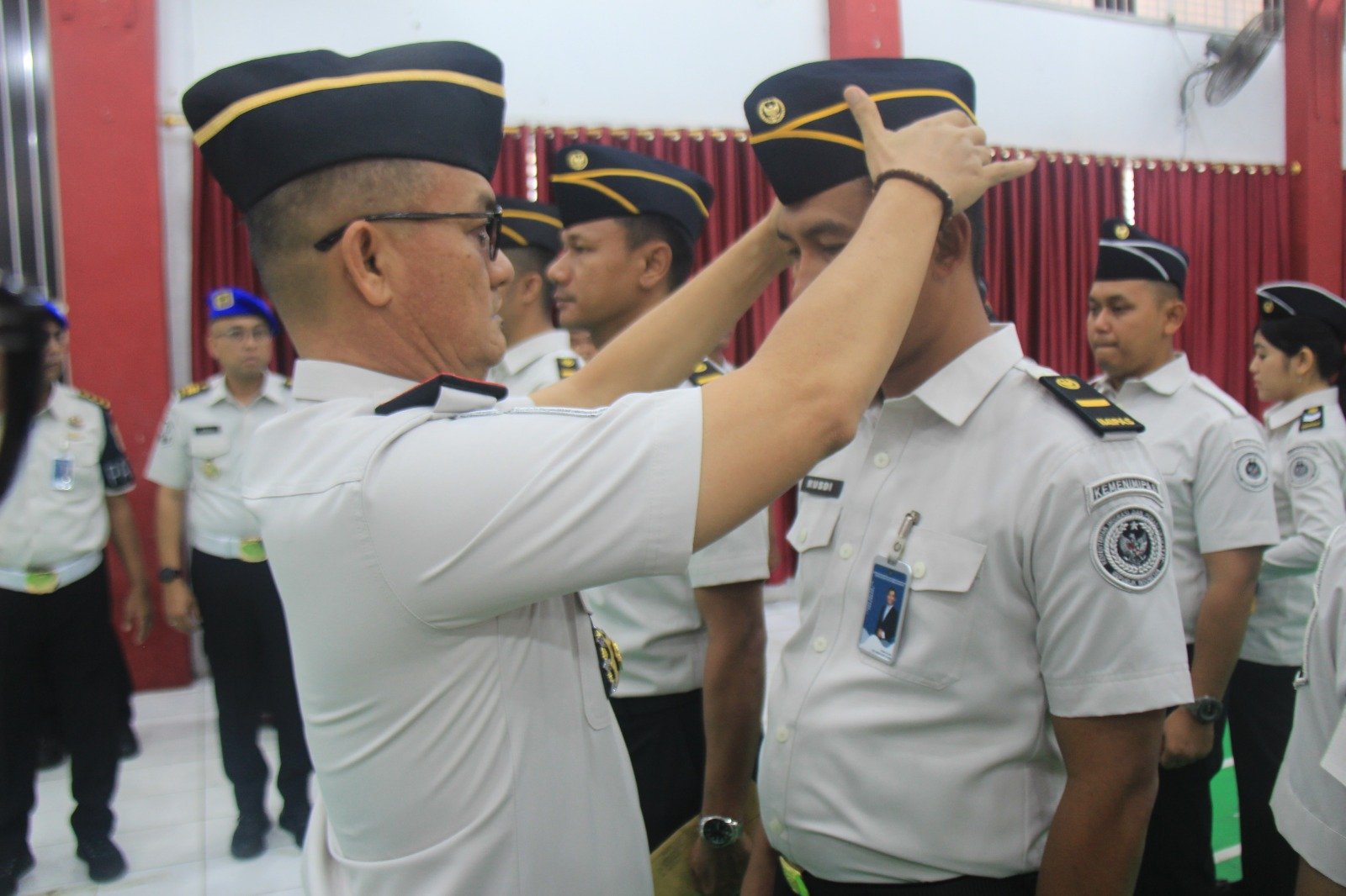 Prosesi dilanjutkan dengan penyematan tanda pangkat baru kepada perwakilan pegawai yang naik pangkat, disaksikan oleh seluruh peserta upacara. Suasana haru dan bangga turut mewarnai momen tersebut, terutama bagi para pegawai yang telah menunjukkan dedikasi dan loyalitas selama bertugas.