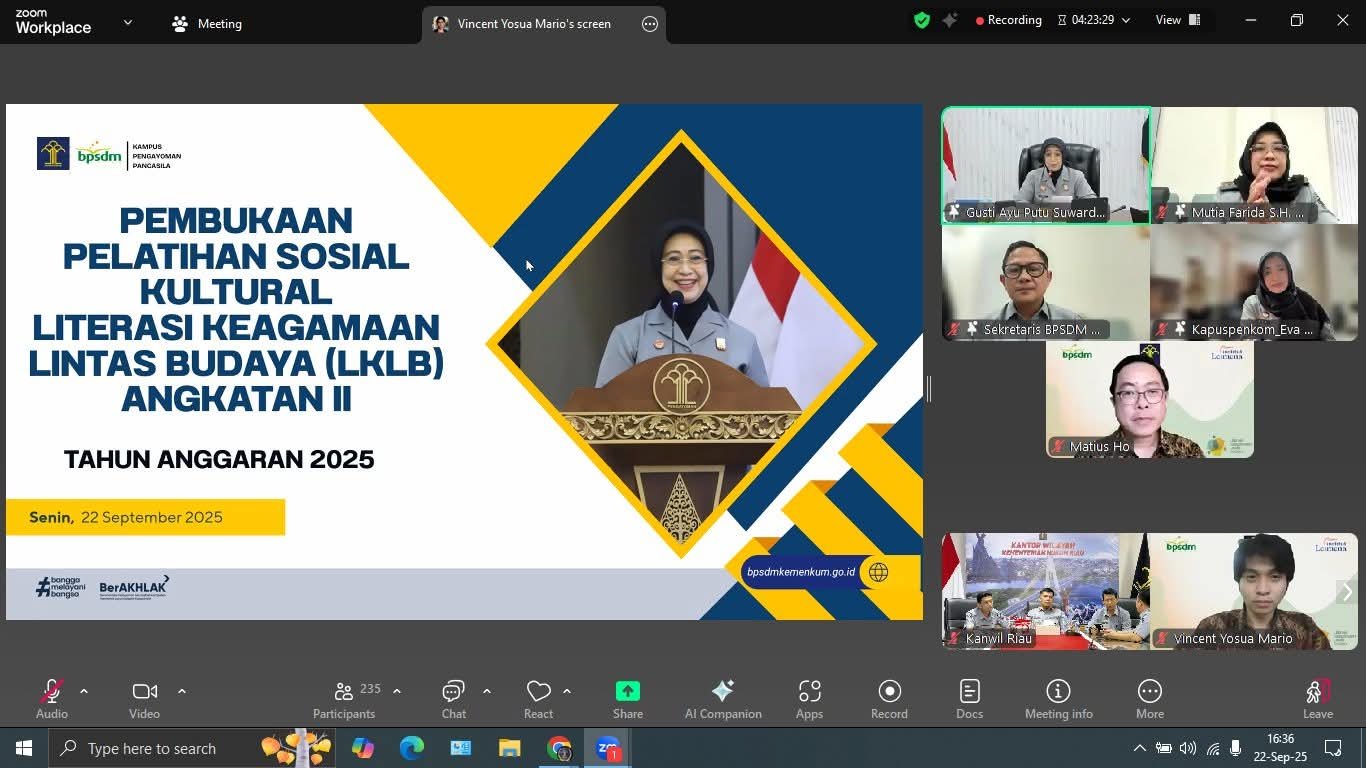 DETEKSI24.com – PEKANBARU – Kepala Kantor Wilayah Kementerian Hukum Riau, Rudy Hendra Pakpahan, bersama jajaran mengikuti kegiatan Pembukaan Pelatihan Sosial Kultural Literasi Keagamaan Lintas Budaya Angkatan II Tahun 2025 melalui Zoom Meeting, Senin (22/9/2025).