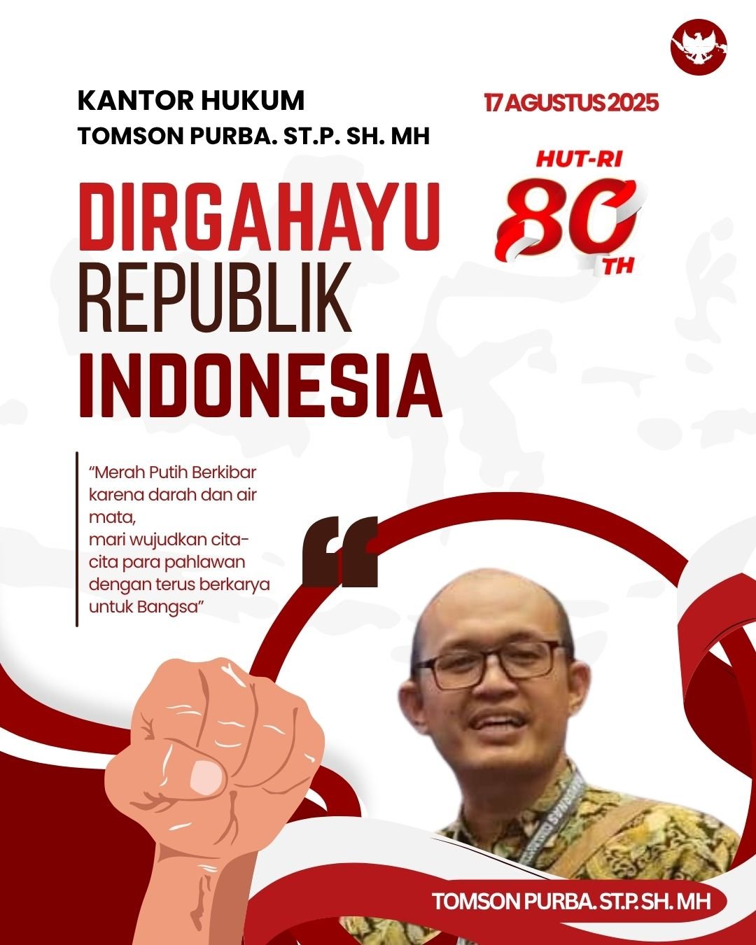 Deteksi24.com, TEBO, – Dalam rangka memperingati hari kemerdekan Negara Kesatuan Republik Indonesia, Kantor Hukum Tomson Purba. ST.P. SH. MH mengucapkan Selamat Ulang Tahun NKRI yang ke-80.
