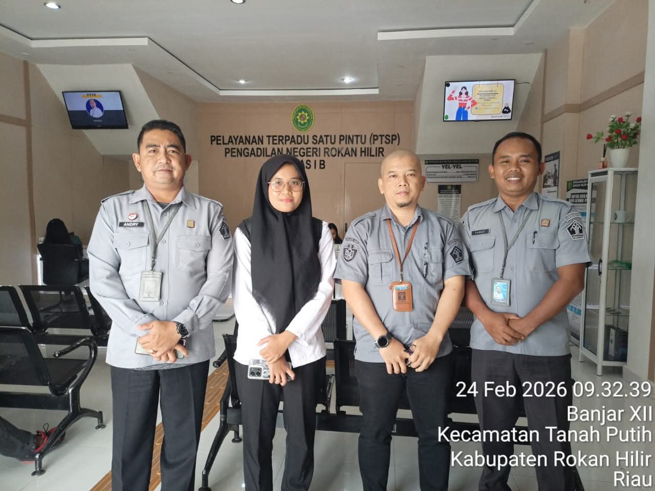 Setibanya di lokasi, tim melakukan pelaporan kehadiran melalui PTSP Pengadilan Negeri Rokan Hilir serta mengikuti agenda persidangan dengan menyerahkan dokumen legal standing para penerima kuasa. Proses administrasi dilakukan secara tertib dan sesuai mekanisme peradilan.