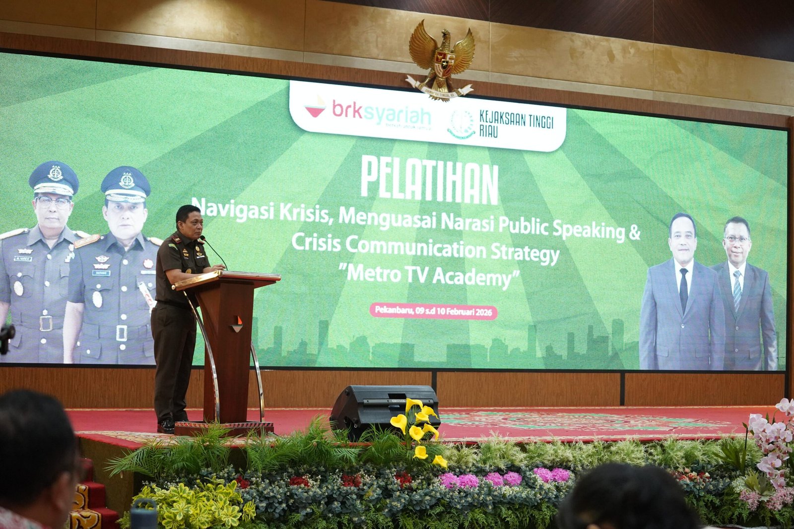DETEKSI24.COM – PEKANBARU – Kejaksaan Tinggi Riau menggerlar Pelatihan Navigasi Krisis, Menguasai Narasi Public Speaking & Crisis Communication Strategy bersama Bank Riau-Kepri Syariah dan Metro TV Academy, bertempat di Aula Gedung Dang Merdu Bank Riau- Kepri Syariah dan Sasana H. M Prasetyo Gedung Satya Adhi Wicaksana Kejaksaan Tinggi Riau, Senin (09/02/2026).