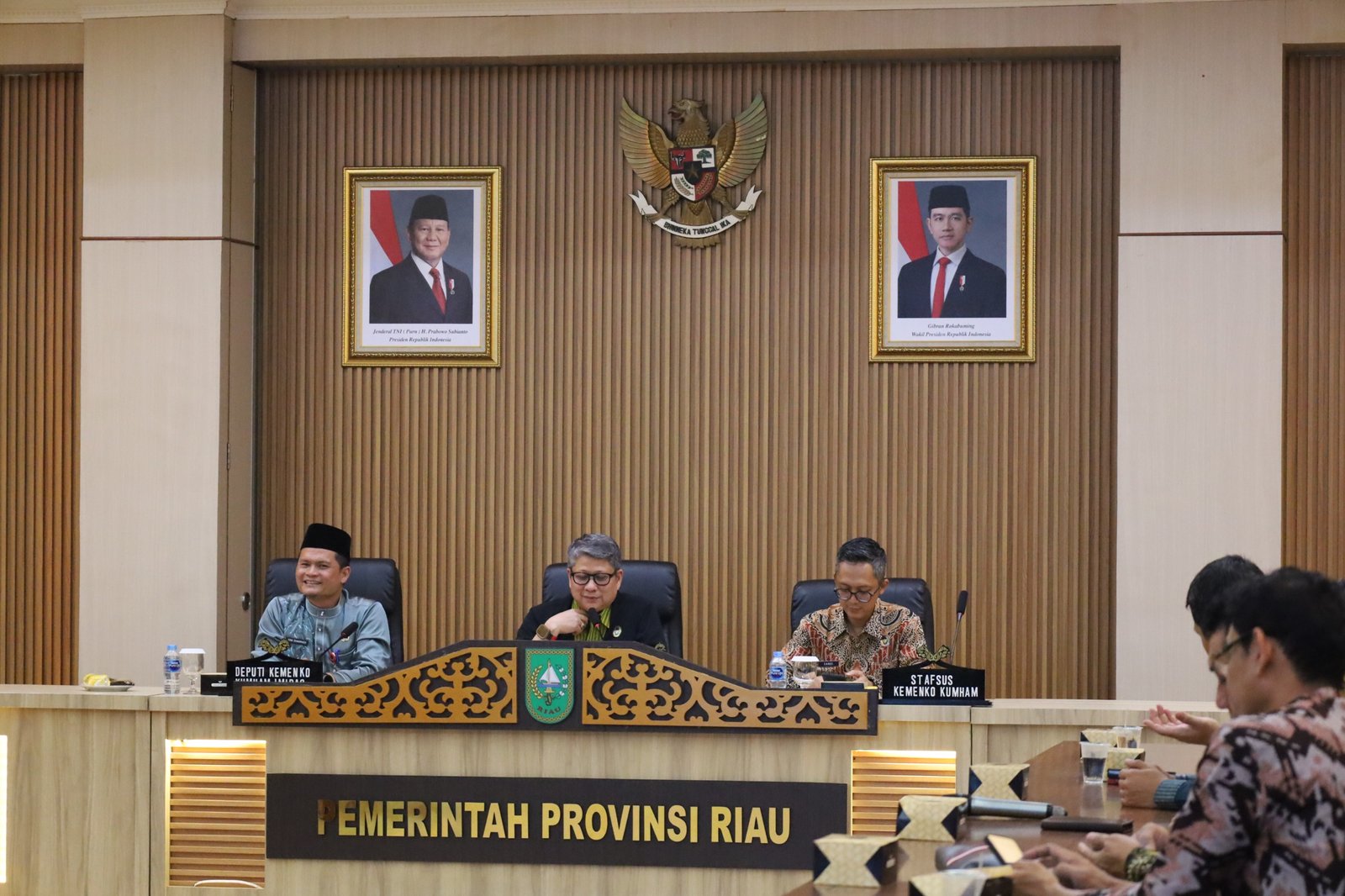 Kepala Kantor Wilayah Kementerian Hukum Riau, Rudy Hendra Pakpahan, mendampingi Deputi Bidang Koordinasi Hukum Kementerian Koordinator Bidang Hukum, HAM, Imigrasi, dan Pemasyarakatan (Kemenko Kumham Imipas) dalam agenda Audiensi dan Koordinasi Terkait Reformasi Regulasi di Daerah bersama Gubernur Riau, bertempat di Ruang Melati Kantor Gubernur Provinsi Riau, Jumat (31/10/2025).