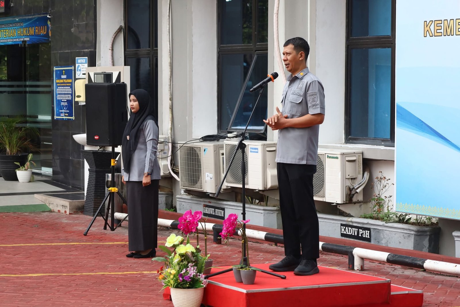 DETEKSI24.com – PEKANBARU – Kantor Wilayah Kementerian Hukum Riau (Kanwil Kemenkum Riau) melaksanakan Apel Pagi rutin yang dipimpin oleh Kepala Divisi Pelayanan Hukum (Yankum), Febri Mujiono, pada Senin (13/10/2025).