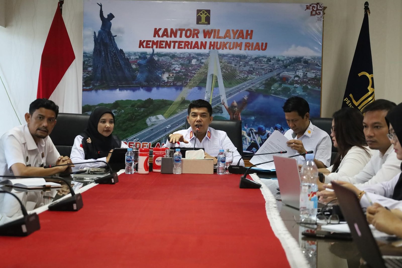 Bertempat di ruang rapat Kakanwil, kegiatan ini diikuti langsung oleh Kepala Kantor Wilayah, Rudy Hendra Pakpahan, bersama Kepala Divisi Pelayanan Hukum, Febri Mujiono, Kepala Divisi Peraturan Perundang-undangan dan Pembinaan Hukum, Yeni Nel Ikhwan, serta jajaran.