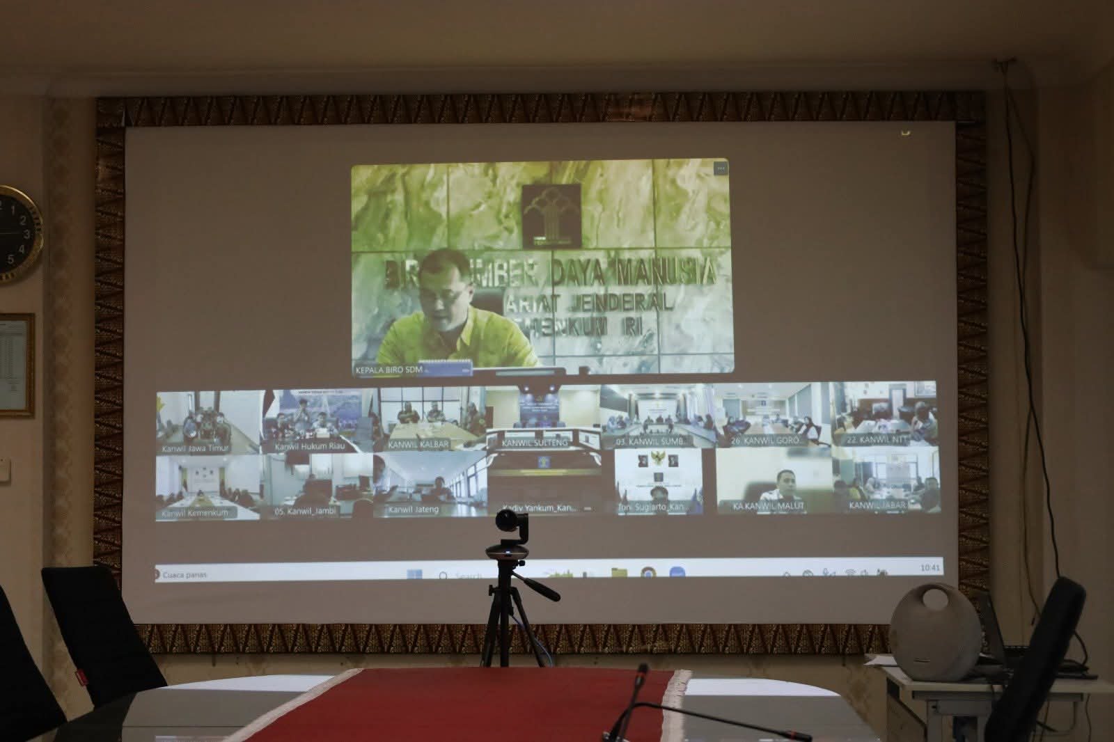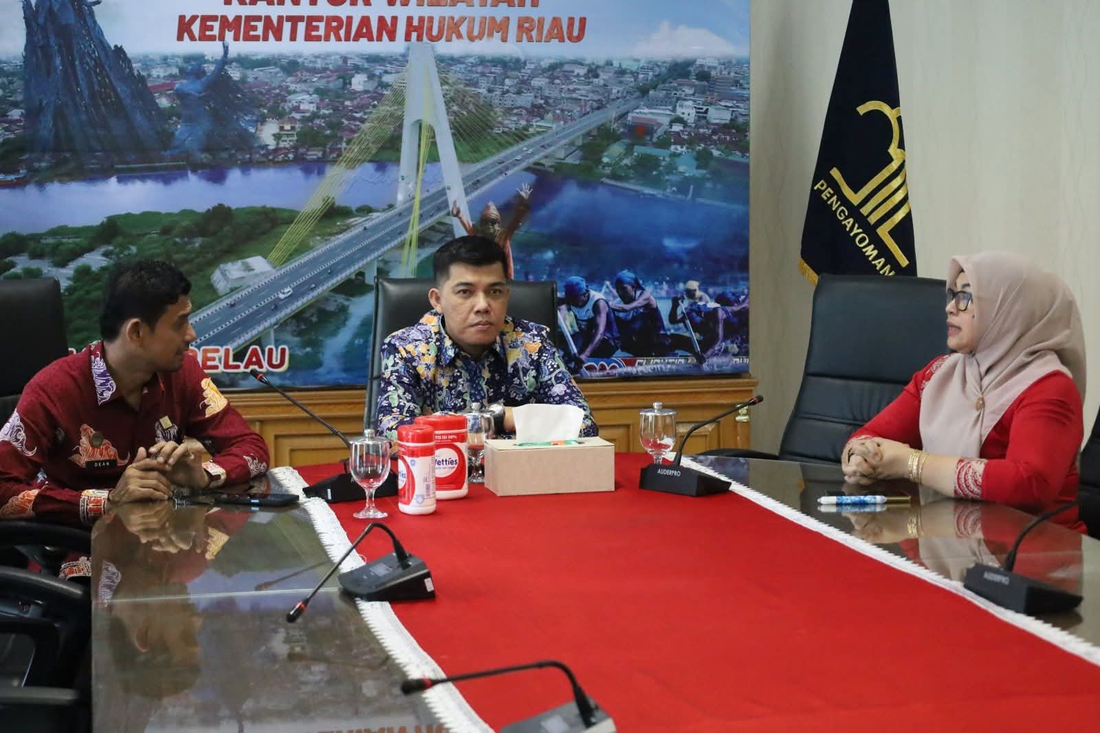 Kepala Kanwil Kemenkum Riau Rudy, Hendra Pakpahan bersama Kepala Bagian Tata Usaha dan Umum, Dean Satria mengikuti rapat persiapan melalui Zoom Meeting, Kamis (25/9/2025).