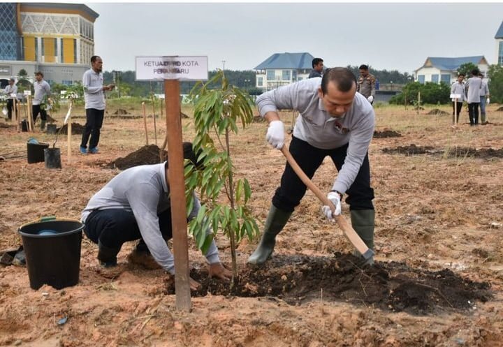 Deteksi24.com, PEKANBARU— Ketua DPRD Kota Pekanbaru Muhammad Sabarudi ikut serta dalam penanaman puluhan bibit pohon pada pada momen Raker Komwil 1 APEKSI 2024. Bibit pohon ini ditanam di sekitar Komplek Pemerintah Kota Pekanbaru, Sabtu (4/5/2024).
