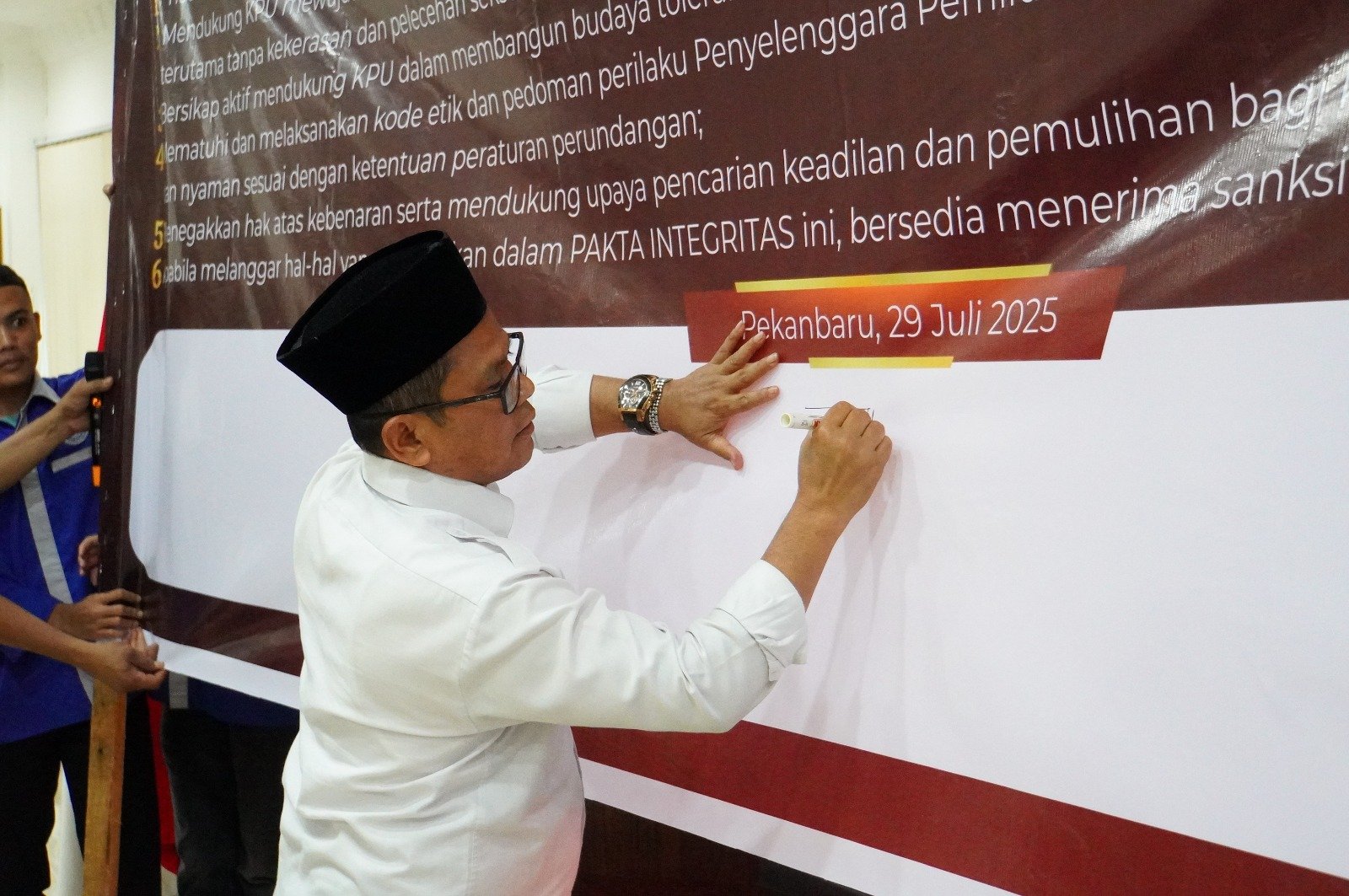 Acara dilanjutkan dengan pembacaan Pakta Integritas Pencegahan dan Penanganan Kekerasan Seksual yang kemudian ditandatangani oleh Ketua, anggota dan Sekretariat KPU Provinsi Riau. Pakta integritas ini juga akan ditandatangani oleh seluruh pejabat struktural dan staf Sekretariat KPU Provinsi Riau.