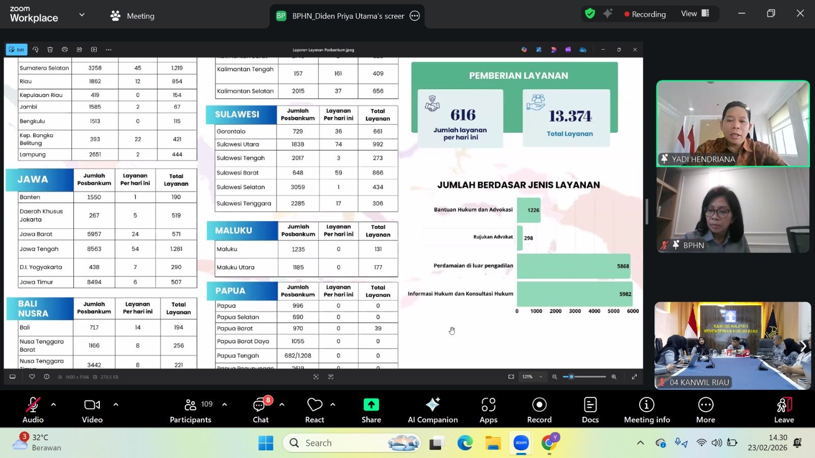 Rapat kemudian dilanjutkan dengan diskusi pada breakout room Regional II yang dipimpin oleh Penyuluh Hukum Ahli Utama, Ibu Marciana. Dalam forum tersebut, Kanwil Kemenkum Riau yang diwakili Rudy Hendra Pakpahan sebagai Kakanwil Kemenkum Riau menyampaikan bahwa Pemerintah Provinsi Riau telah berkomitmen mendukung pelaksanaan Posbankum melalui alokasi Bantuan Khusus Keuangan Pemerintah Provinsi Riau.