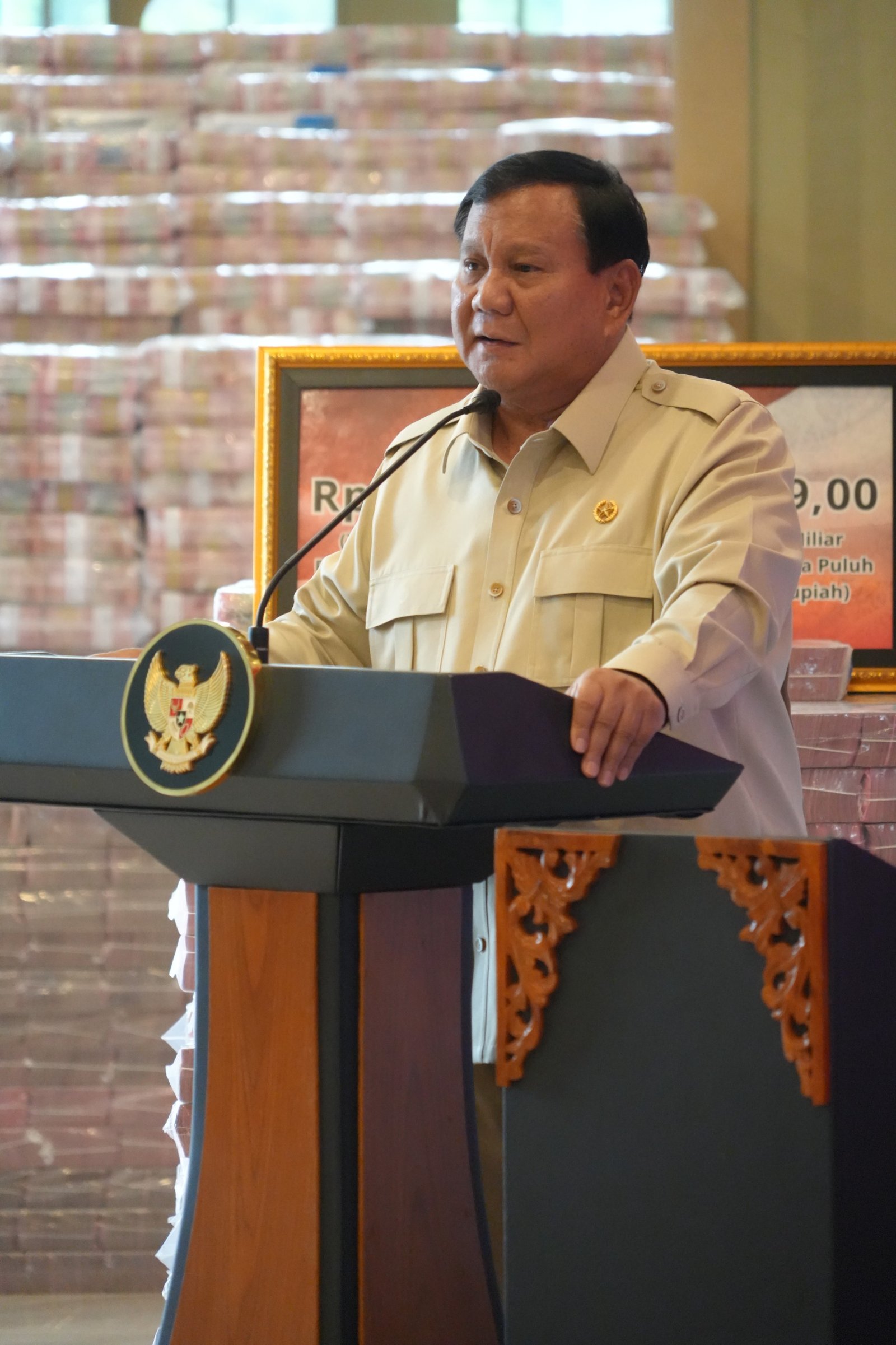 Presiden RI Prabowo Subianto hadir menyaksikan kegiatan simbolis yang dilaksanakan di Gedung Utama Kejaksaan Agung tersebut, Senin (20/19/2025).
