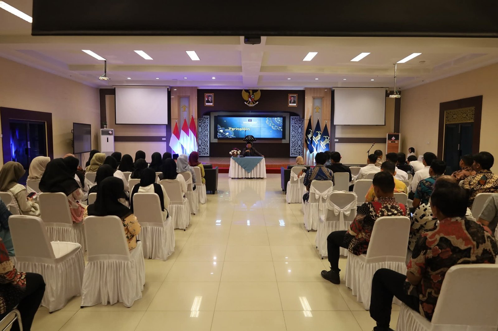 Suasana khidmat menyelimuti aula saat para pegawai menyimak paparan mengenai pentingnya menjaga keseimbangan antara hubungan kepada Sang Pencipta (hablum minallah) dan hubungan antarsesama manusia (hablum minannas), yang dalam konteks pekerjaan diwujudkan melalui pelayanan publik yang prima.