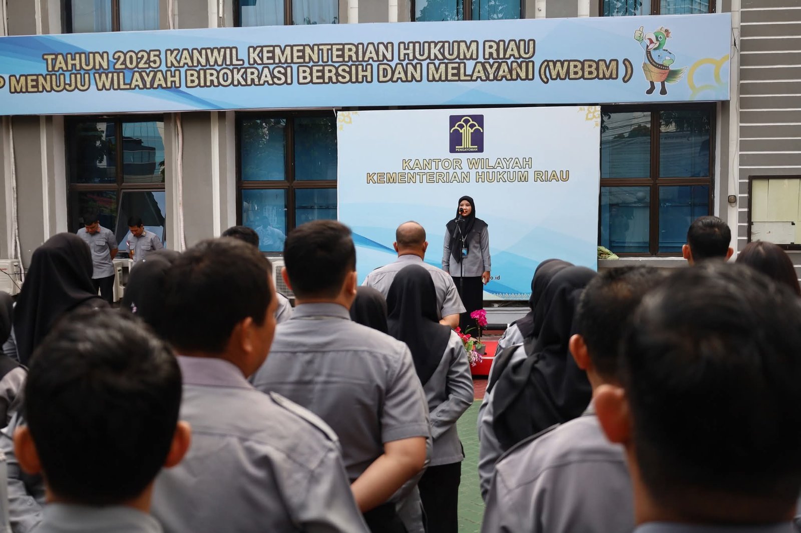 Kegiatan ini dihadiri langsung oleh Kepala Kantor Wilayah Kemenkum Riau Rudy Hendra Pakpahan, Kepala Divisi Pelayanan Hukum Febri Mujiono, Kepala Divisi P3H Yeni Nel Ikhwan, serta seluruh jajaran pejabat struktural, fungsional, pelaksana, PPPK, CPNS, dan peserta Magang Hub.