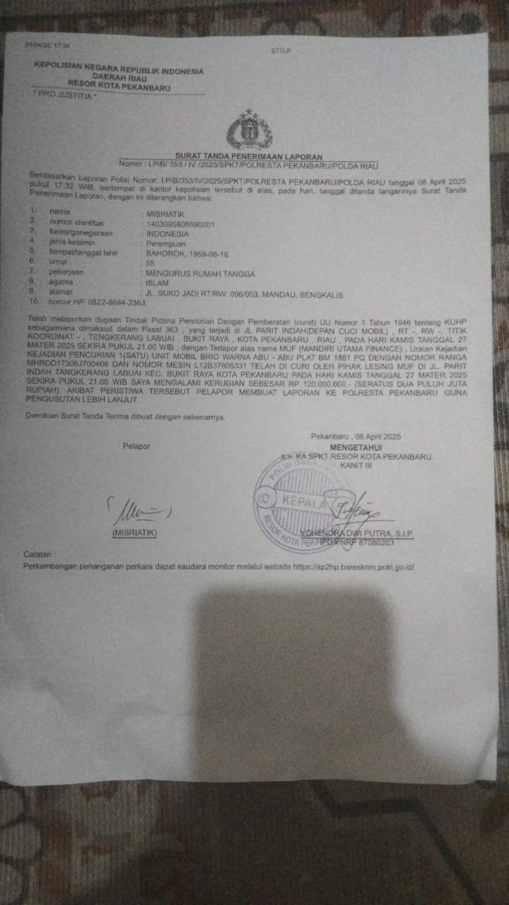 Berdasarkan laporannya, Misriatik menyebut mobil yang diduga dicuri dengan pemberatan adalah Honda Brio dengan nomor polisi BM 1861 PO, nomor rangka MHRDD17300617HOE, dan nomor mesin 112037805331. Unit kendaraan tersebut diambil oleh orang yang mengaku dari pihak leasing Mandiri Utama Finance (MUF) Cabang Dumai.