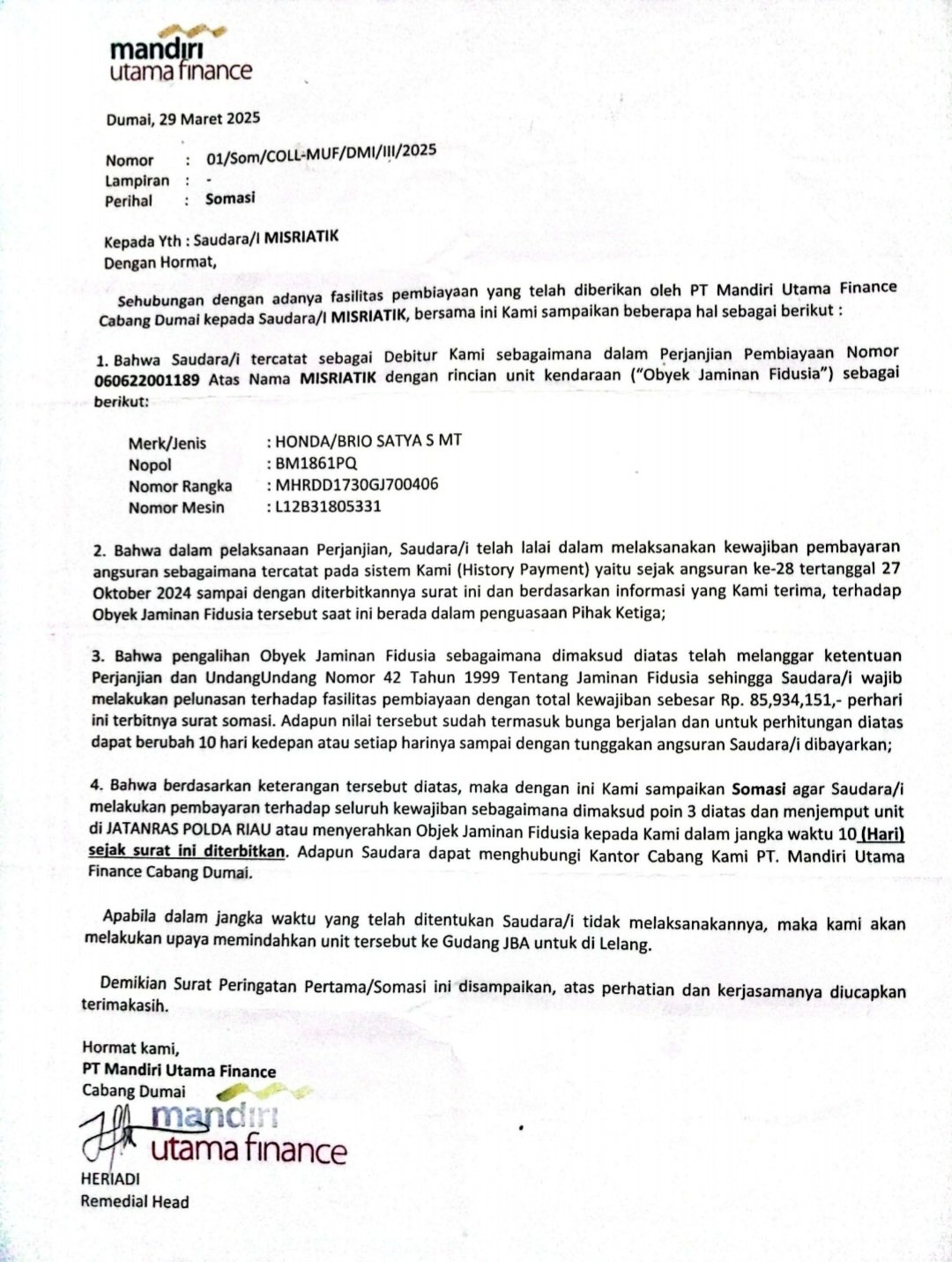Leasing MUF Membawa-bawa Jatanras Polda Riau. Ia mengungkapkan, setelah dilakukan upaya penarikan secara paksa pada 27-28 Maret 2025, pihak leasing Mandiri Utama Finance (MUF) Cabang Dumai mengirimkan surat somasi kepada Debitur pada tertanggal 29 Maret 2025. Anehnya, pada point 4 (empat) dalam surat somasi tersebut, pihak leasing MUF Dumai membawa-bawa pihak Jatanras Polda Riau.