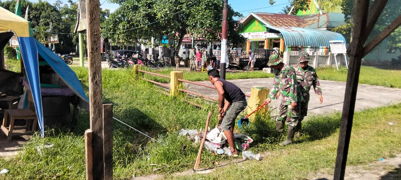 Personel Satuan Tugas (Satgas) TMMD ke-124 tampak bahu membahu bersama puluhan warga Bukit Kayu Kapur membersihkan area Pasar Minggu.
